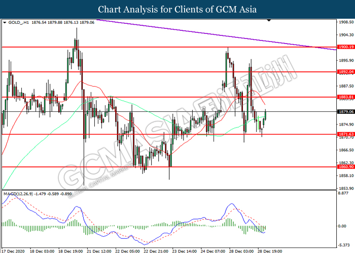 GOLD_, H1: Gold price was traded higher following prior rebound from the support level at 1871.65. MACD which illustrated diminishing bearish momentum suggest the commodity to extend its gains toward resistance level at 1883.80.