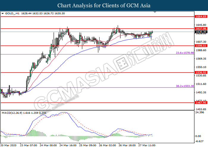 GOLD_, H1: Gold price was traded higher following prior rebound from the 50 moving average line (Blue). MACD which illustrate diminishing bearish momentum suggest the commodity to extend its gains toward the resistance level at 1637.05.