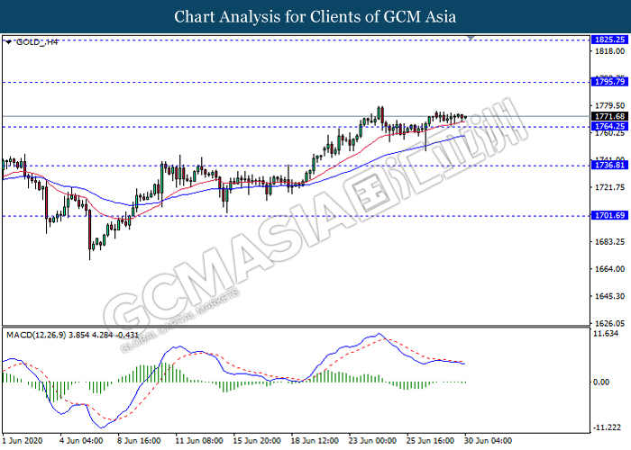 GOLD_, H4: Gold price was traded flat while currently testing near support level 1764.25. However, MACD which illustrate bearish bias signal with the formation of death cross suggest the commodity to be traded lower after it breaks below the support level.