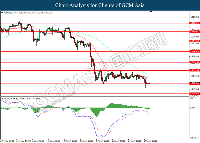GOLD_, H4: Gold price was traded lower while currently testing the support level at 1760.40. MACD which illustrated increasing bearish momentum suggest the commodity to extend its losses after it successfully breakout below the support level.
