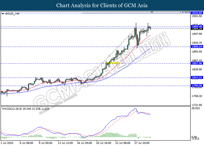 GOLD_, H4: Gold price was traded higher while currently testing the resistance level 1969.50. However, MACD which illustrate bearish momentum signal with the recent formation of death cross suggest the commodity to be traded lower as a technical correction towards the support level 1908.55.