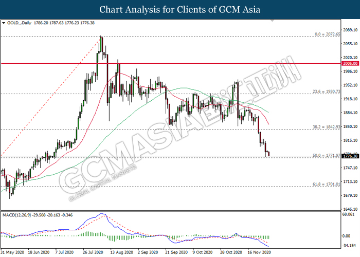 GOLD_, Daily: Gold price was traded lower while currently testing near 1772.00. MACD which illustrate bearish signal suggest its price to extend its losses after closing below the support level.