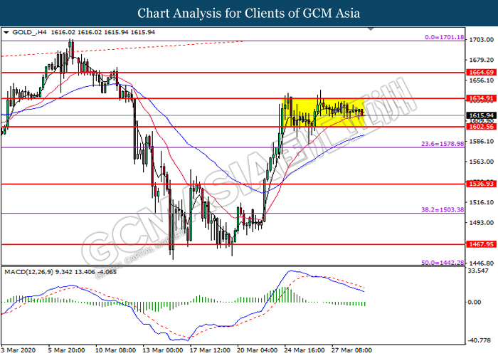 GOLD_, H4: Gold price was traded lower following prior retracement from the resistance level at 1634.90. MACD which illustrate bearish bias momentum suggest the commodity to extend its losses toward the support level at 1602.55.