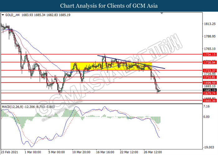 GOLD_, H4: Gold price was traded lower while currently testing the support level at 1679.75. MACD which illustrated bearish bias momentum signal suggest the commodity to extend its losses after it successfully breakout below the support level.