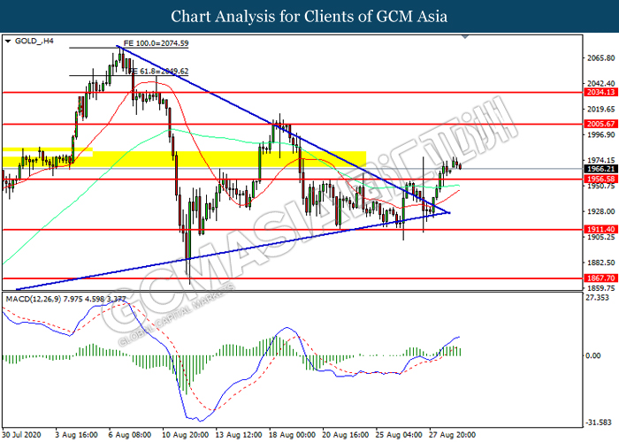 GOLD_, H4: Gold price was traded higher following prior breakout above the previous resistance level at 1956.60. However, MACD which illustrated diminishing bullish momentum suggest the commodity to be traded lower in short-term as technical correction.