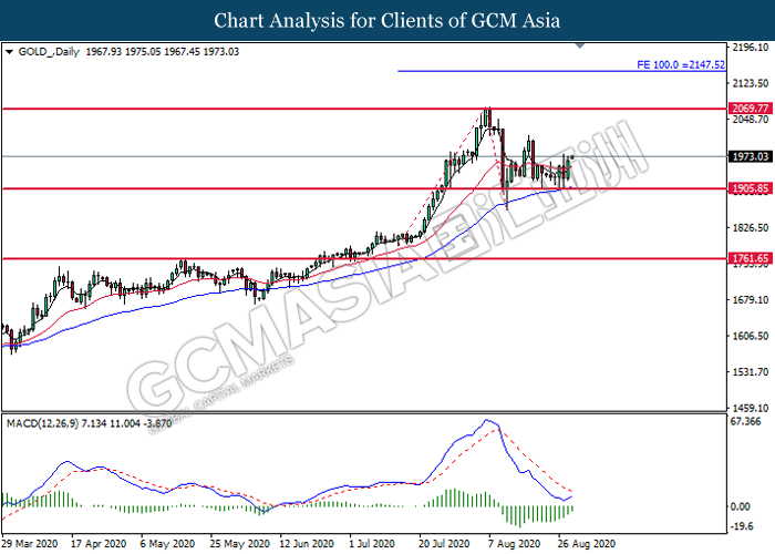 GOLD_, Daily: Gold price was traded higher following prior rebound from the support level at 1905.85. MACD which illustrated diminishing bearish momentum suggest the commodity to extend its gains toward the resistance level at 2069.75.