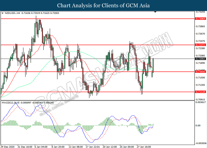 NZDUSD, H4: NZDUSD was traded higher following prior rebound from the support level at 0.7165. MACD which illustrated increasing bullish momentum suggest the pair to extend its gains toward resistance level at 0.7235.