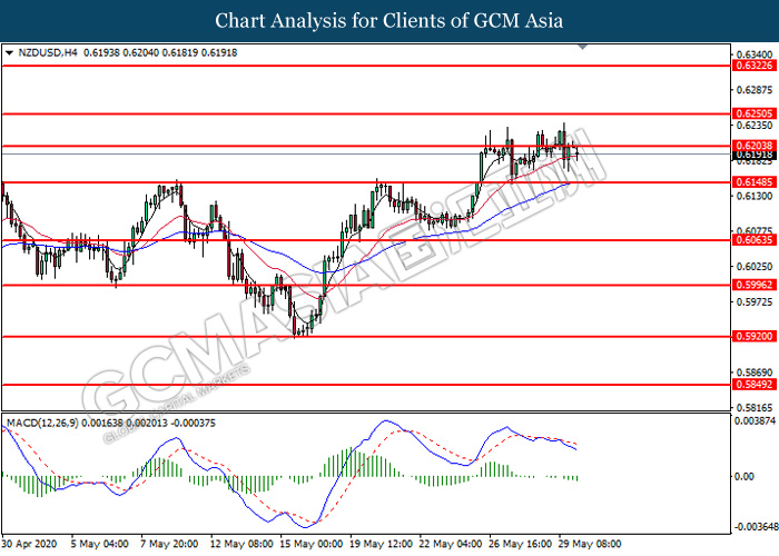 NZDUSD, H4: NZDUSD was traded lower following prior retracement from the resistance level at 0.6205. MACD which illustrates bearish bias momentum suggest the pair to extend its losses toward the support level at 0.6150.