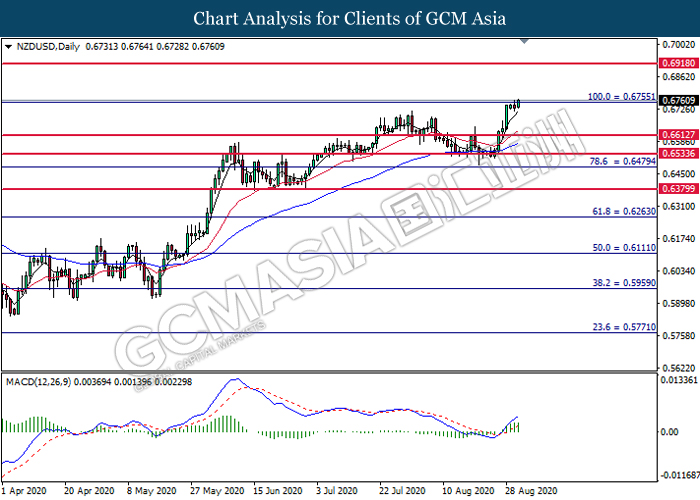 NZDUSD, Daily: NZDUSD was traded higher while currently testing the resistance level at 0.6755. MACD which illustrated bullish bias momentum suggest the pair to extend its gains after it successfully breakout above resistance level at 0.6755.