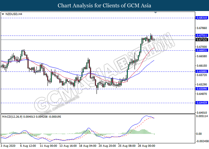 NZDUSD, H4: NZDUSD was traded flat near the resistance level 0.6750. However, MACD which illustrate bearish bias signal with the formation of death cross suggest the pair to be traded lower as a technical correction towards the support level 0.6685.