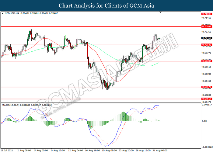 NZDUSD, H4: NZDUSD was traded higher following prior breakout above the previous the resistance level at 0.7015. However, MACD which illustrated diminishing bullish momentum suggest the pair to be traded lower in short-term as technical correction.