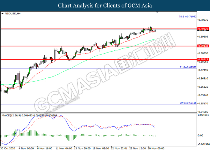 NZDUSD, H4: NZDUSD was traded higher while currently testing the resistance level at 0.7035. However, MACD which illustrated increasing bearish momentum suggest the pair to be traded lower in short-term as technical correction.