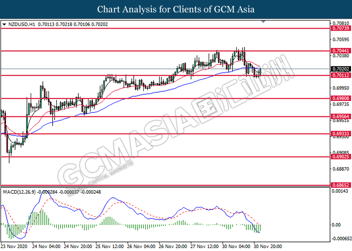 NZDUSD, H1: NZDUSD was traded higher following prior rebound from the support level at 0.7010. MACD which illustrate diminishing bearish momentum signal suggest the pair to extend its gains toward the resistance level at 0.7045.