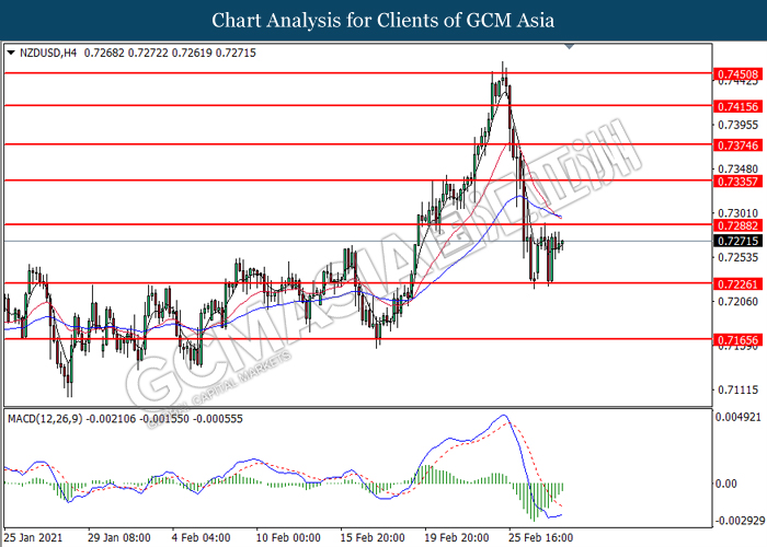NZDUSD, H4: NZDUSD was traded higher following prior rebound from the support level at 0.7225. MACD which illustrated diminishing bearish momentum suggest the pair to extend its gains toward the resistance level at 0.7290.