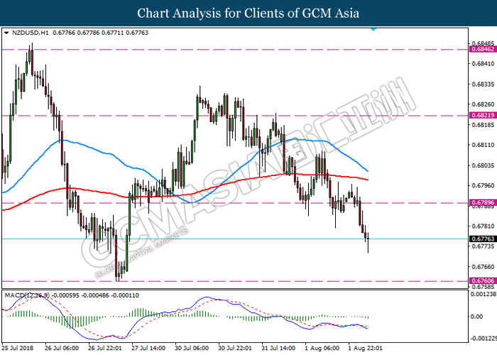 NZDUSD, H1: NZDUSD was traded lower following prior breakout below the support level 0.6790. MACD which illustrate ongoing bearish momentum suggest the pair may extend its losses towards the next support level 0.6760.