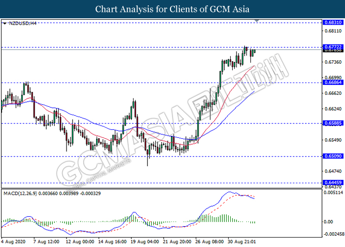 NZDUSD, H4: NZDUSD was traded higher while currently testing the resistance level 0.6720. However, MACD which illustrate bearish momentum signal with the formation of death cross suggest the pair to experience technical correction towards the support level 0.6885.