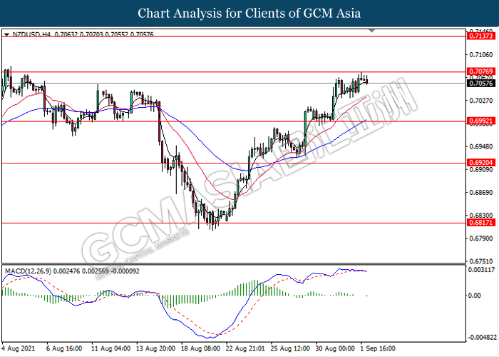 NZDUSD, H4: NZDUSD was traded higher while currently testing near the resistance level 0.7075. MACD which illustrate bearish momentum signal with the formation of death cross suggest the pair to be traded lower as a technical correction towards the support level 0.6990.