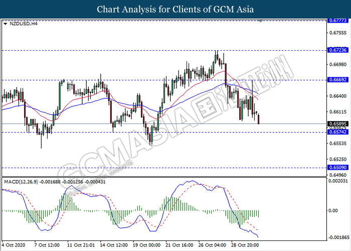 NZDUSD, H4: NZDUSD was traded lower while currently testing near the support level 0.6575. MACD which illustrate bearish momentum signal suggest the pair to extend its losses after it breaks below the support level.