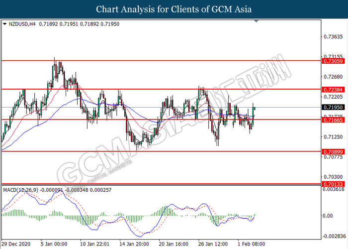 NZDUSD, H4: NZDUSD was traded higher following prior breakout above the previous resistance level at 0.7165. MACD which illustrated bullish bias momentum suggest the pair to extend its gains toward the resistance level at 0.7240.