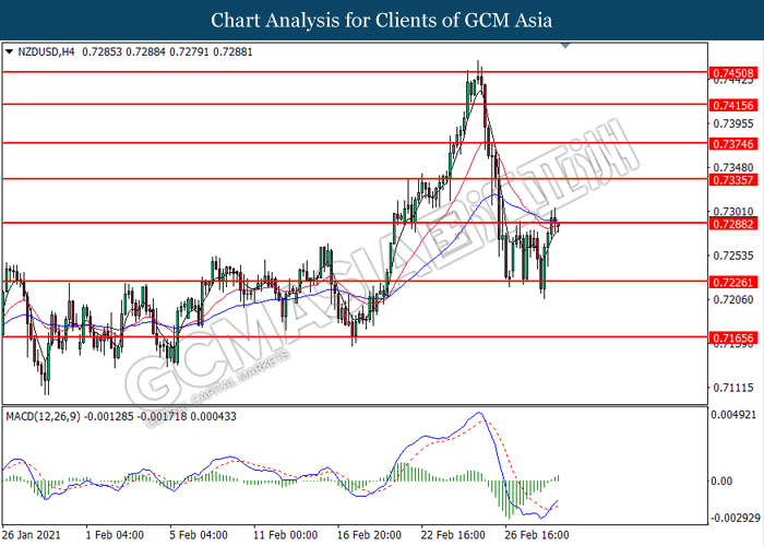 NZDUSD, H4: NZDUSD was traded higher while currently testing the resistance level at 0.7290. MACD which illustrated bullish bias momentum suggest the pair to extend its gains after it successfully breakout above the resistance level.