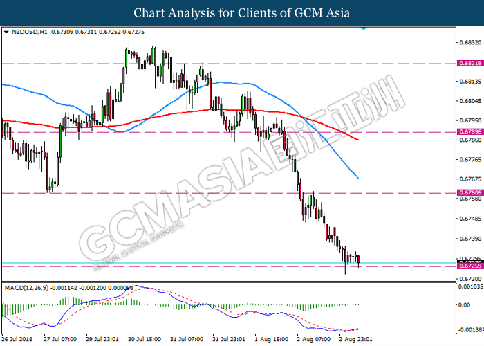 NZDUSD, H1: NZDUSD was traded lower while currently testing the support level 0.6725. MACD which display a diminished bearish momentum with the starting formation of golden cross suggest the pair may experience a short term technical correction the resistance level 0.6760.