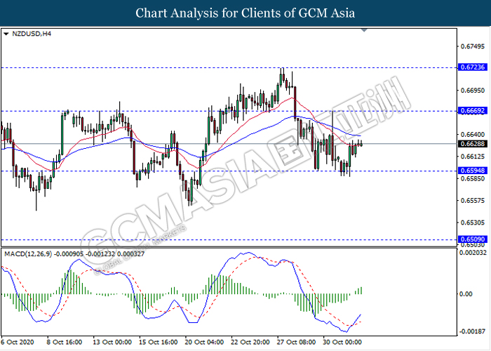 NZDUSD, H4: NZDUSD was traded higher following prior rebound from the support level 0.6595. MACD which illustrate bullish momentum signal with the formation of golden cross suggest the pair to extend its rebound towards the resistance level 0.6670.