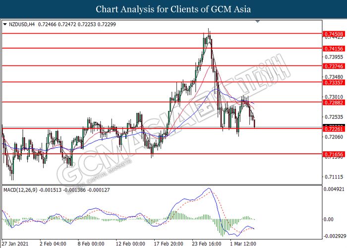 NZDUSD, H4: NZDUSD was traded lower while currently testing the support level at 0.7225. MACD which illustrated diminishing bullish momentum suggest the pair to extend its losses after it successfully breakout below the support level.