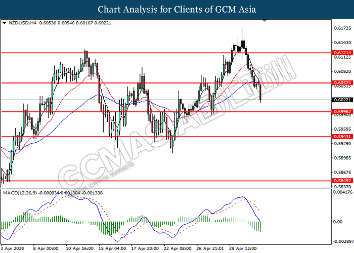 NZDUSD, H4: NZDUSD was traded lower following prior breakout below the previous support level at 0.6055. MACD which illustrate bearish bias momentum suggest the pair to extend its losses toward the support level at 0.5995.