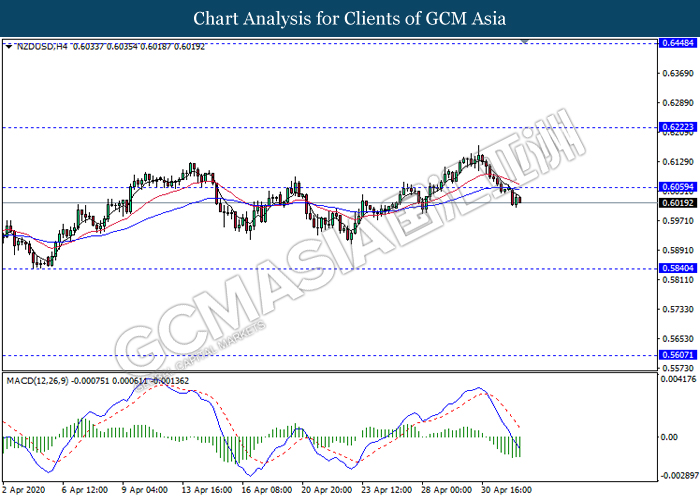 NZDUSD, H4: NZDUSD was traded lower following prior breakout below the previous support level 0.6060. MACD which illustrate ongoing bearish bias suggest the pair to extend its losses towards the support level 0.5840.