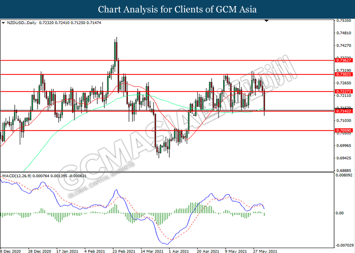 NZDUSD, Daily: NZDUSD was traded lower while currently testing the support level at 0.7140. MACD which illustrated increasing bearish momentum suggest the pair to extend its losses after it successfully breakout below the support level.