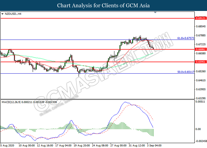 NZDUSD, H4: NZDUSD was traded lower while currently testing the support level at 0.6685. MACD which illustrated increasing bearish momentum suggest the pair to extend its losses after it successfully breakout below the support level.