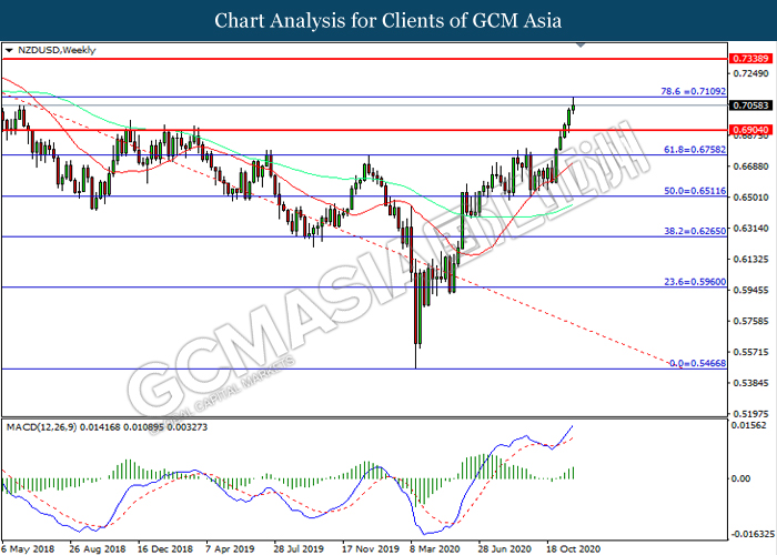 NZDUSD, Weekly: NZDUSD was traded higher while currently testing the resistance level at 0.7110. MACD which illustrated increasing bullish momentum suggest the pair to extend its gains after it successfully breakout above the resistance level.