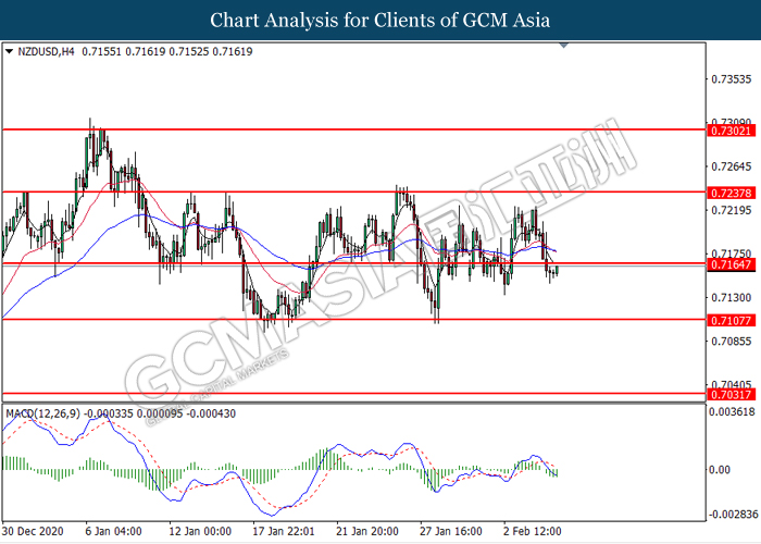 NZDUSD, H4: NZDUSD was traded higher while currently testing the resistance level at 0.7165. MACD which illustrated diminishing bearish momentum suggest the pair to extend its gains after it successfully breakout above the resistance level.