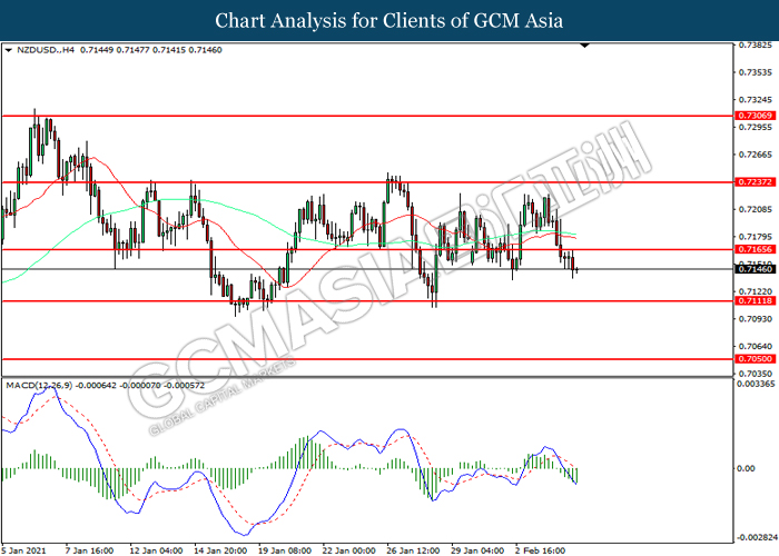 NZDUSD, H4: NZDUSD was traded lower following prior breakout below the previous support level at 0.7165. MACD which illustrated increasing bearish momentum suggest the pair to extend its losses toward support level at 0.7110.