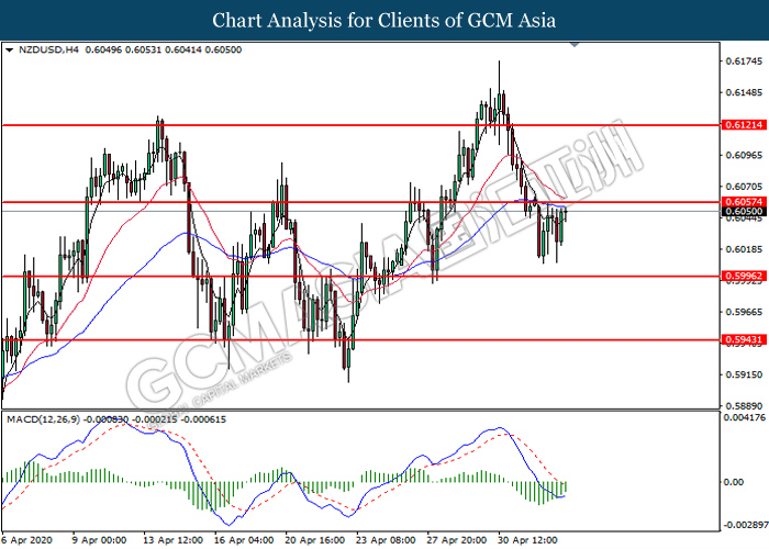 NZDUSD, H4: NZDUSD was traded higher while currently testing the resistance level at 0.6055. MACD which illustrate diminishing bearish momentum suggest the pair to extend its gains after it successfully breakout above the resistance level.