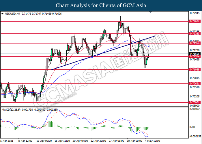 NZDUSD, H4: NZDUSD was traded higher following prior breakout above the previous resistance level at 0.7150. MACD which illustrated diminishing bearish momentum signal suggests the pair to extend its gains toward the resistance level at 0.7195.