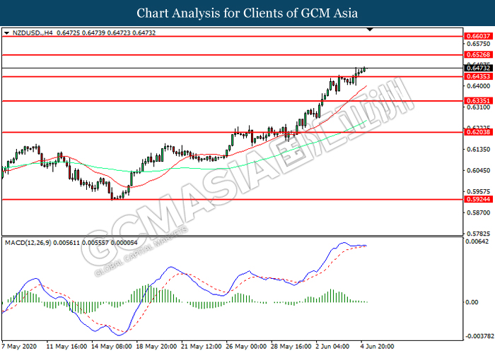 NZDUSD, H4: NZDUSD was traded higher following prior breakout above the previous resistance level at 0.6435. However, MACD which illustrated diminishing bullish momentum suggest the pair to be traded lower in short-term as technical correction.