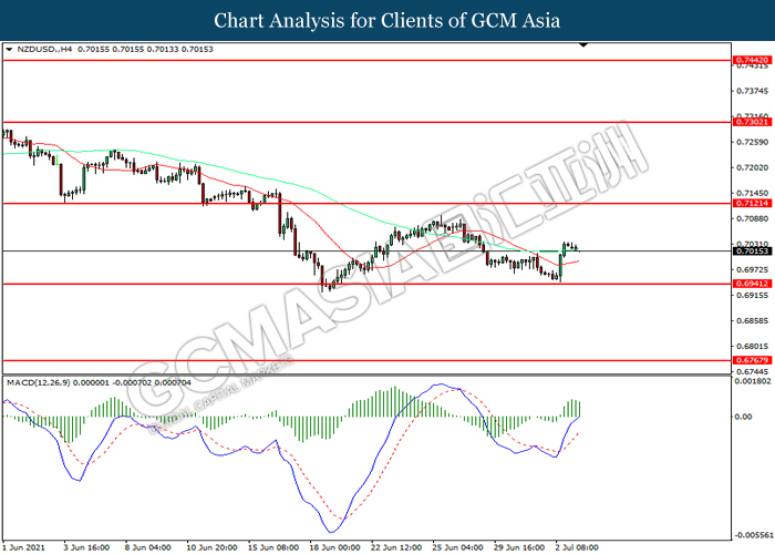 NZDUSD, H4: NZDUSD was traded higher following prior rebound from the support level at 0.6940. However, MACD which illustrated diminishing bullish momentum suggest the pair to be traded lower in short-term as technical correction.