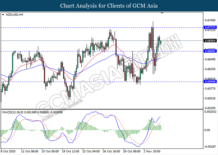 NZDUSD, H4: NZDUSD was traded higher following prior breakout above the previous resistance level 0.6670. MACD which illustrate ongoing bullish momentum signal suggest the pair to extend its gains towards the resistance level 0.6725.