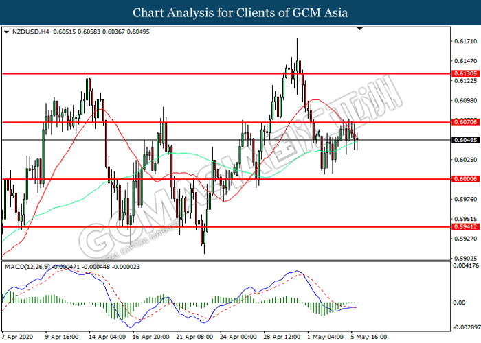 NZDUSD, H4: NZDUSD was traded lower following prior retracement from the resistance level at 0.6070. However, MACD which illustrated diminishing bearish momentum suggest the pair to be traded higher in short-term as technical correction.