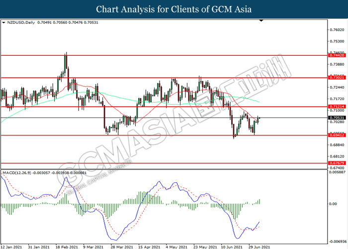 NZDUSD, Daily: NZDUSD was traded higher following prior rebound from the support level at 0.6940. MACD which illustrated increasing bullish momentum suggest the pair to extend its gains toward resistance level at 0.7120.