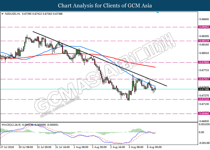 NZDUSD, H1: NZDUSD was traded lower following recent retracement from the resistance level 0.6755. MACD which display bearish signal with starting formation of death cross suggest the pair may extend its losses towards the support level 0.6720.