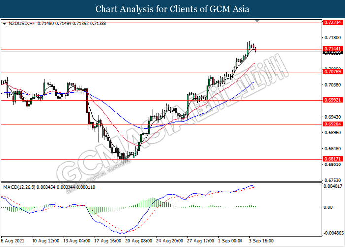 NZDUSD, H4: NZDUSD was traded lower following prior retracement from the resistance level 0.7145. MACD which illustrate diminishing bullish momentum signal suggest the pair to extend its retracement towards the support level 0.7075.
