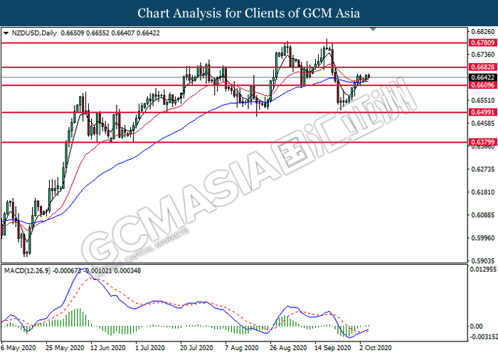 NZDUSD, Daily: NZDUSD was traded higher following prior breakout above the previous resistance level at 0.6610. MACD which illustrate bullish bias signal suggest the pair to extend its gains towards the resistance level 0.6685.