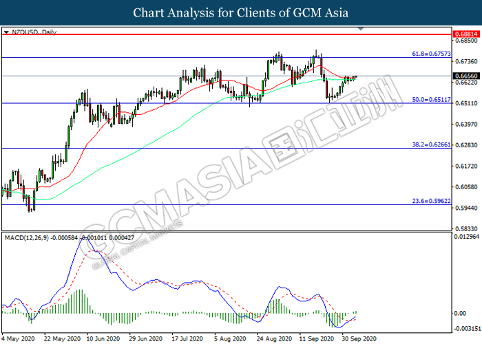 NZDUSD, Daily: NZDUSD was traded higher following prior rebound from the support level at 0.6510. MACD which illustrated increasing bullish momentum suggest the pair to extend its gains toward resistance level at 0.6755.