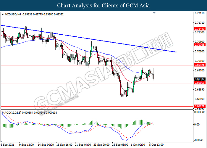 NZDUSD, H4: NZDUSD was traded lower while currently testing near the support level 0.6915. MACD which illustrate diminishing bullish momentum signal suggest the pair to extend its losses after it breaks below the support level 0.6915.