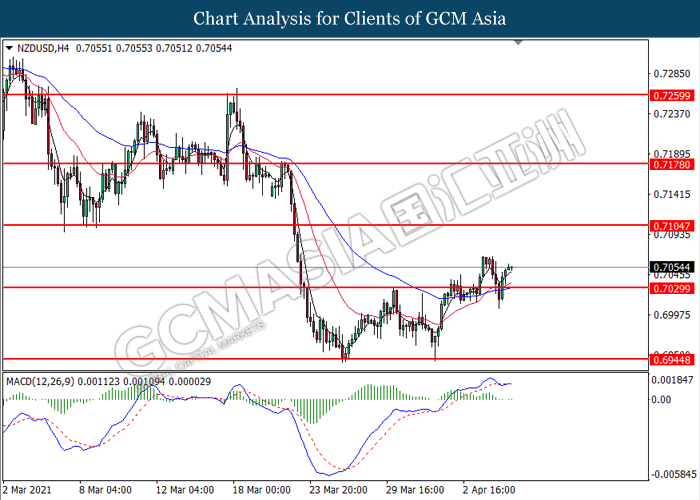 NZDUSD, H4: NZDUSD was traded higher following prior breakout above the previous resistance level at 0.7030. MACD which illustrated bullish bias momentum signal suggests the pair to extend its gains toward the resistance level at 0.7105.