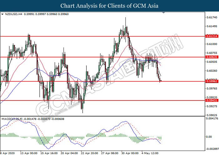 NZDUSD, H4: NZDUSD was traded lower while currently testing the support level at 0.5995. MACD which illustrates bearish bias momentum suggest the pair to extend its losses after it successfully breakout below the support level.