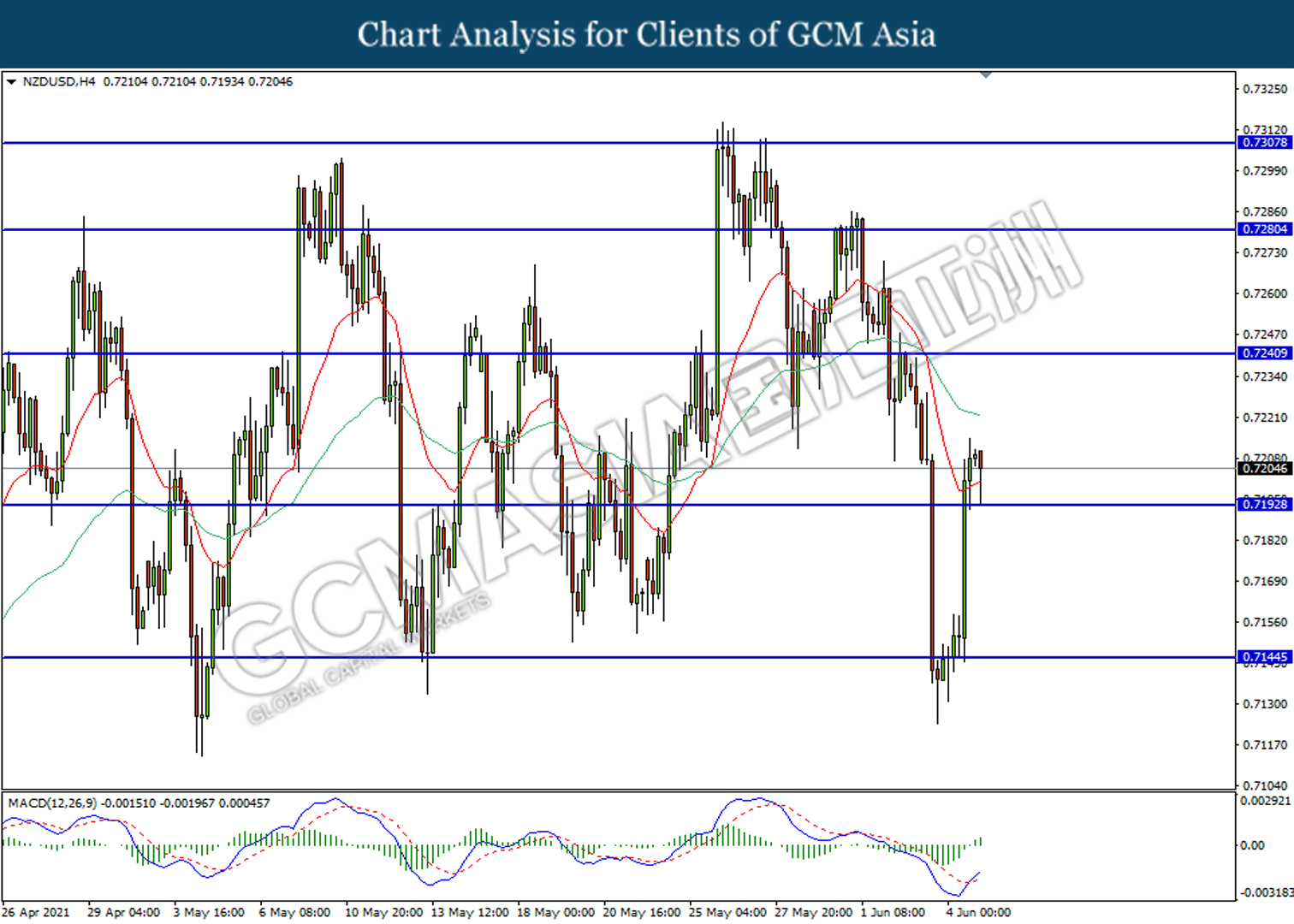 NZDUSD, H4: NZDUSD was traded higher following prior rebound from the support level at 0.7190. MACD which illustrated bullish momentum suggest the pair to be traded higher in short-term.