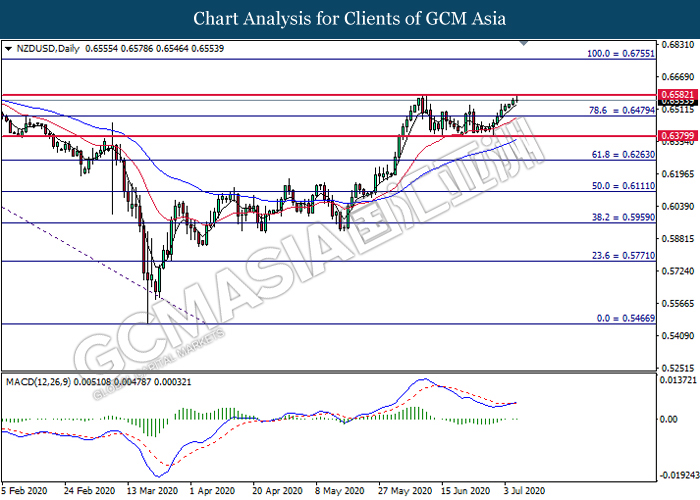 NZDUSD, Daily: NZDUSD was traded higher while currently testing the resistance level at 0.6580. MACD which illustrate bullish momentum signal suggest the pair to extend its gains after it successfully breakout above the resistance level.